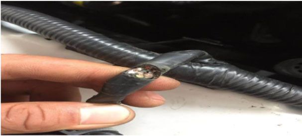 2、在排查前舱配电盒到水泵继电器的线束时发现继电器座下面的线束分支被冷却电扇磨断了,对此处线束检修处理后毛病扫除。